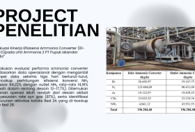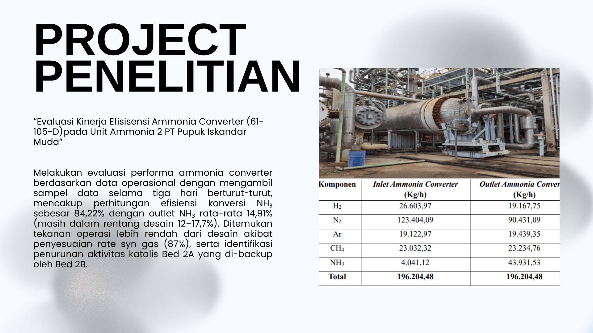 • Memastikan proses produksi berjalan lancar dan sesuai prosedur dengan melakukan pemantauan rutin terhadap pengukuran partikel produk, suhu, dan kinerja alat, serta mengidentifikasi masalah operasional. • Menyusun dan mengelola laporan operasional harian Pabrik Ammonia 2 sebagai dasar pemantauan proses dan analisis kerja. • Mengolah data hasil produksi tahun 2024 dan menyajikannya dalam bentuk grafik untuk mendukung pelaporan dan evaluasi kinerja operasional. • Merevisi diagram alur proses unit sintesa ammonia menggunakan Microsoft Visio agar dapat meningkatkan efisiensi dan keandalan proses produksi dengan desain alur yang lebih optimal. • Membuat Process Flow Diagram (PFD) untuk tahapan persiapan cooling down ammonia, pelaksanaan cooling down tahap 1 dan 2, proses unloading, stop unloading, serta pembersihan jalur (clearing line) sebagai bagian dari dokumentasi operasional.