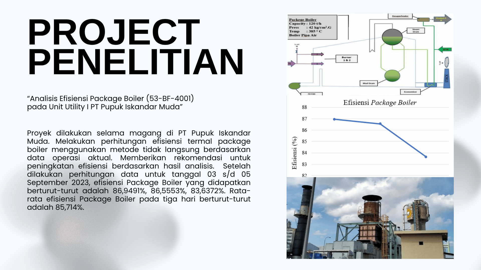• Melakukan pengujian dan pemantauan kinerja proses produksi secara realtime menggunakan Distributed Control System (DCS) oleh Toyo Engineering. • Melakasanakan Observasi lapangan secara langsung dan berkala di unit pabrik yang diawasi oleh instruktur pabrik untuk memahami operasional dan prosedur keselamtan kerja. • Melakukan pengumpulan data gas alam dari laboratorium utama dan data operasional agar dapat memastikan ketersediaan informasi yang akurat untuk analisis lebih lanjut. • Melakukan perhitungan efesiensi kesetimbangan massa dan energi pada unit Package Boiler 53-BF-4001 berdasarkan data operasional aktual di Pabrik Utilitas 1.