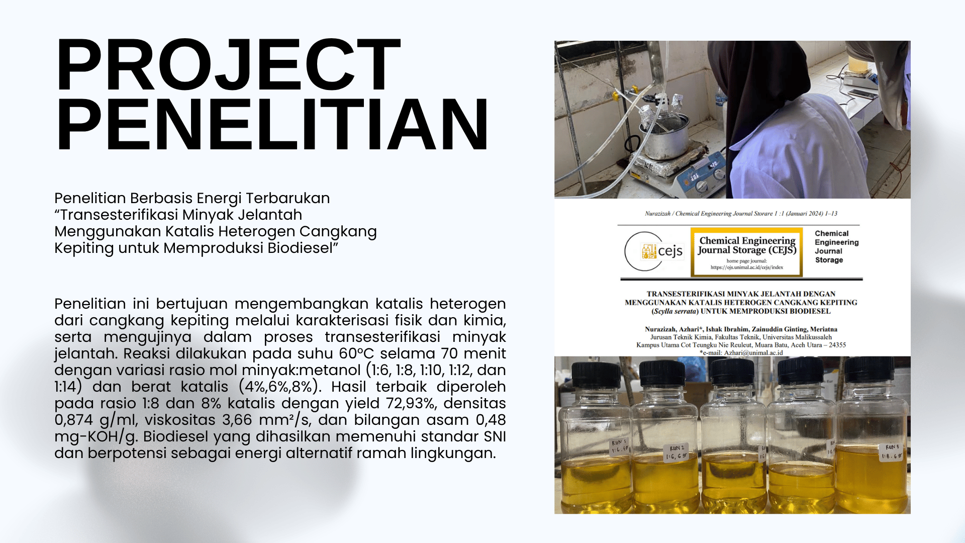 • Berfokus pada peningkatan efisiensi konversi minyak jelantah menjadi biodiesel menggunakan metode transesterifikasi dengan katalis heterogen berbasis cangkang kepiting. • Menganalisis karakterisasi produk biodiesel menggunakan GC-MS dan melakukan pengujian kualitas berdasarkan standar ASTM D6751. • Menganalisis karakteristik katalis menggunakan uji SEM (Scaning Electron Microscopy) dan XRD (X-ray Diffraction) untuk mengetahui morfologi permukaan dan struktur kristal katalis. • Berhasil memproduksi biodiesel dengan nilai yield 72,93% melalui optimasi proses transesterifikasi menggunakan katalis heterogen.