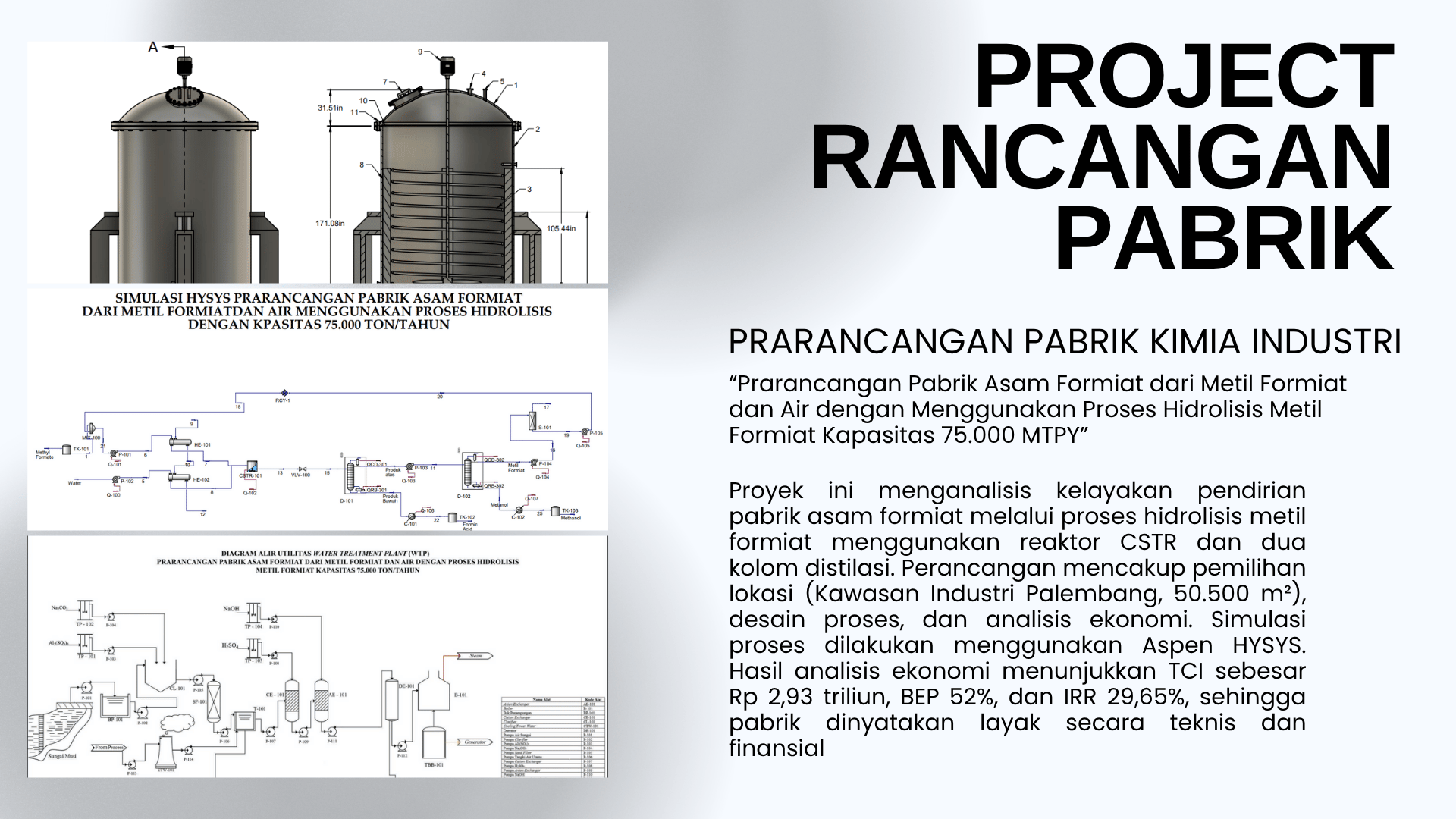 - Final Project : Prarancangan Pabrik Asam Formiat dari Metil Formiat dan Air dengan Proses Hidrolisis Metil Formiat Kapasitas 75.000 MTPY (Tugas Khusus: Reaktor CSTR) - Project Penelitian : “Transesterifikasi Minyak Jelantah Menggunakan Katalis Heterogen Cangkang Kepiting untuk Memproduksi Biodiesel” - Project Penelitian : " “Analisis Efisiensi Package Boiler (53-BF-4001) pada Unit Utility I PT Pupuk Iskandar Muda”. Kegiatan Organisasi: - Himpunan Teknik Kimia (HIMATEMIA) : Sebagai Staf Kesekretariatan, Departemen Kesekretariatan. Jobdesk : Menjabat sebagai sekretaris panitia dalam acara Training Software Simulasi Proses Aspen HYSYS 2024, bertanggung jawab dalam penyusunan notulen, pengelolaan administrasi kegiatan, serta koordinasi komunikasi antar panitia dan peserta. Berperan dalam menyusun proposal kegiatan untuk berbagai acara organisasi sebagai bagian dari perencanaan dan pelaksanaan program kerja. - Chemical Engineering Competition : Sebagai Staf administrasi