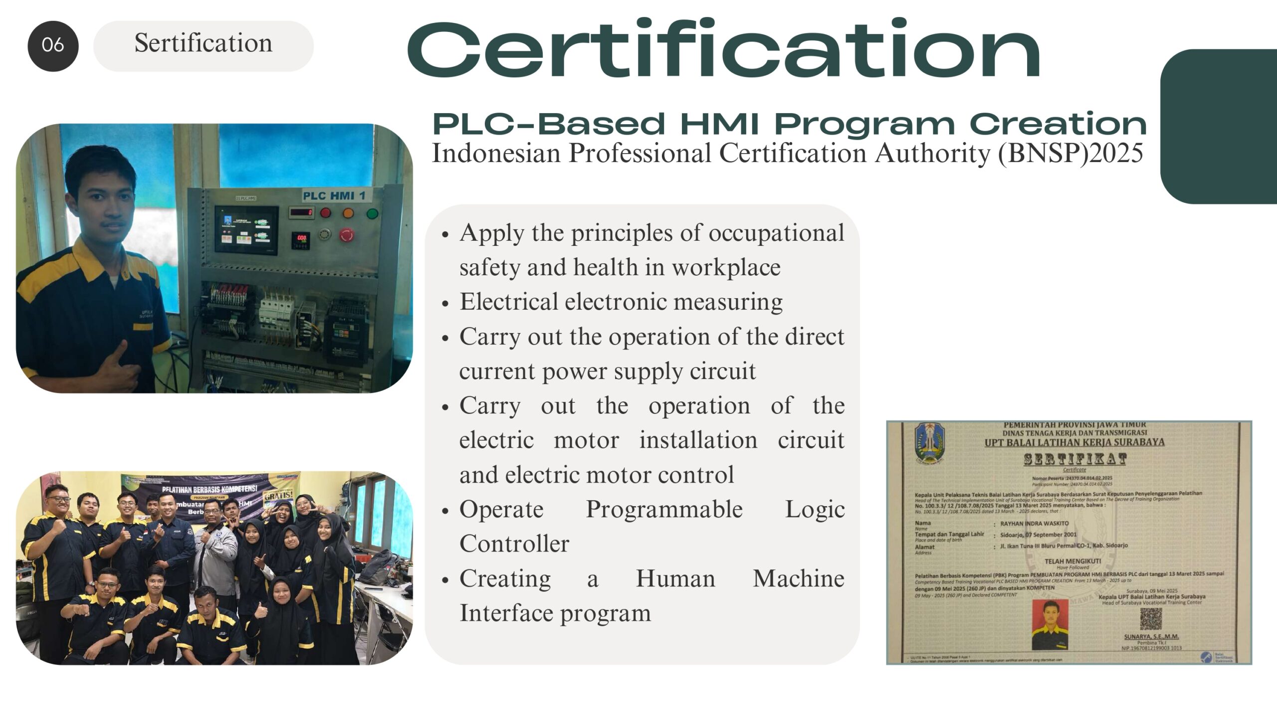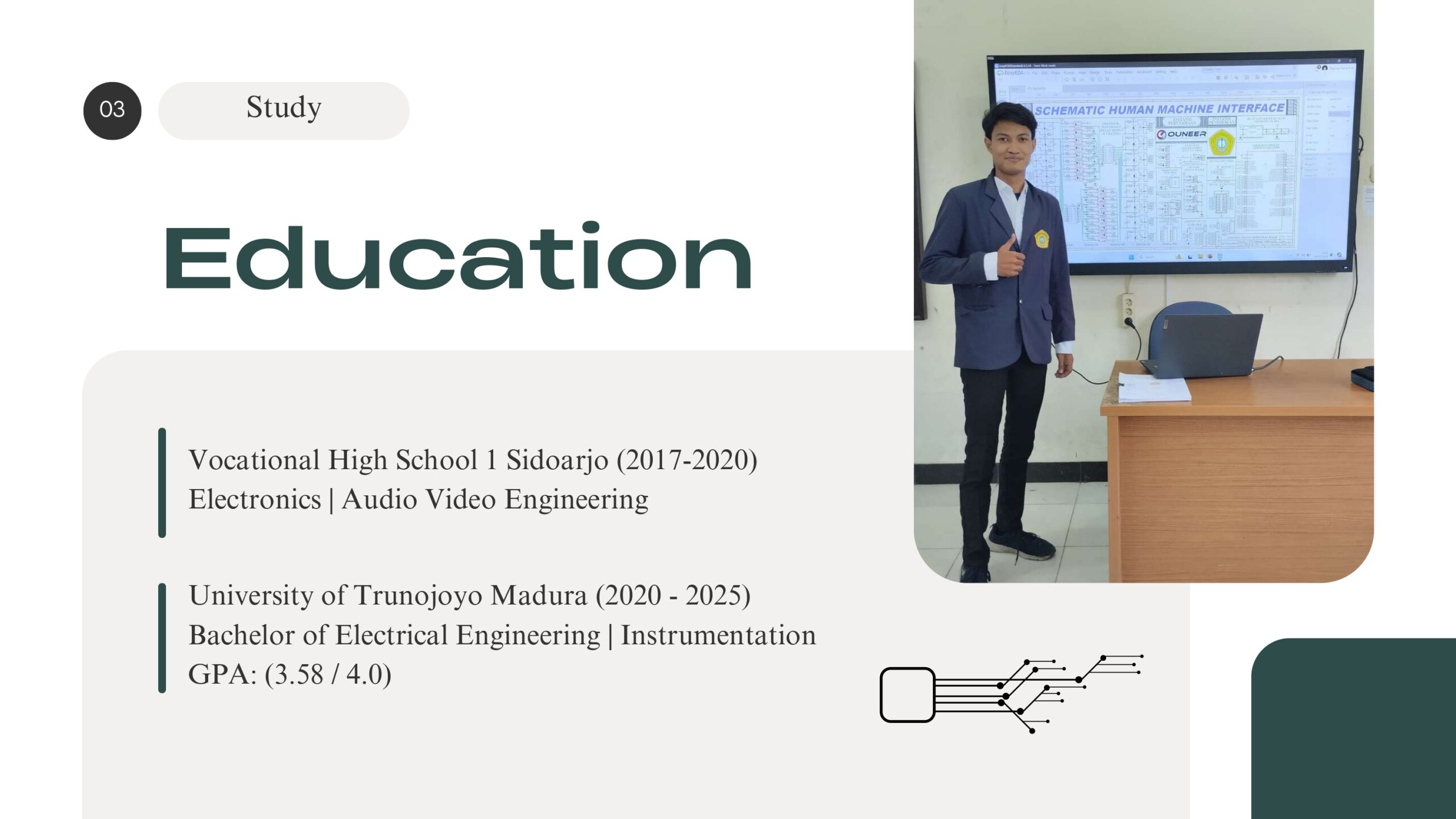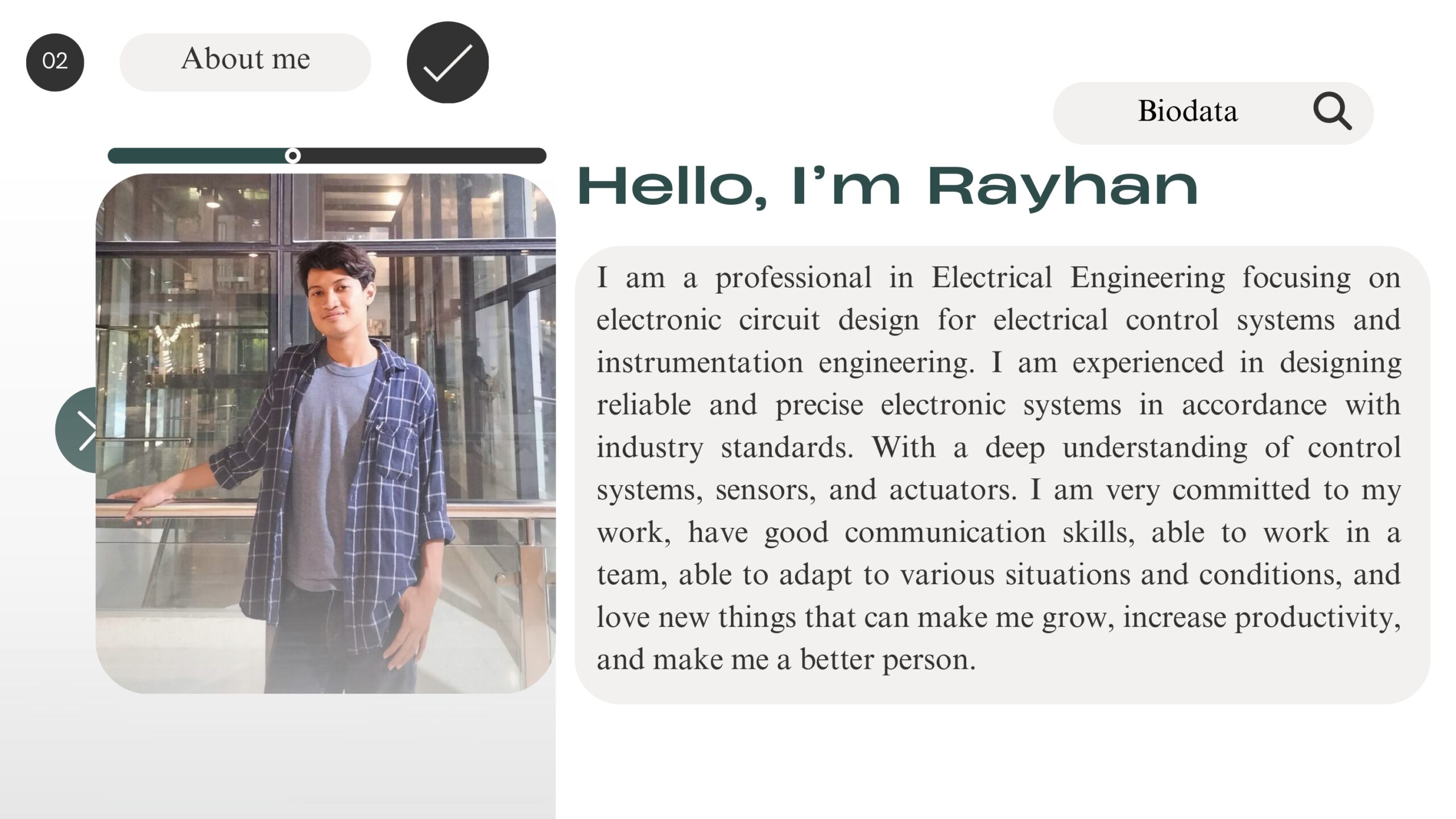 Saya Rayhan Indra Waskito, lulusan Sarjana Teknik Elektro dengan keahlian di bidang sistem kontrol, desain PCB & skematik, dan penguasaan PLC dan HMI. Saya memiliki pengalaman dalam proyek desain skematik PCB untuk sistem otomasi pada kapal patroli, pengalaman sebagai teknisi elektro lebih dari 1 tahun dan pengalaman mengajar teknik elektro di beberapa sekolah menengah di Sidoarjo, Indonesia. Saya memiliki tujuan karir di bidang teknik instrumentasi dan sistem kontrol. Dikenal sebagai pribadi yang cepat belajar, mudah beradaptasi di lingkungan baru, dan mampu bekerja secara individu maupun tim dengan disiplin yang tinggi.